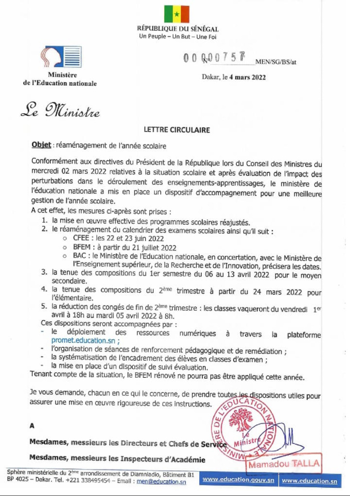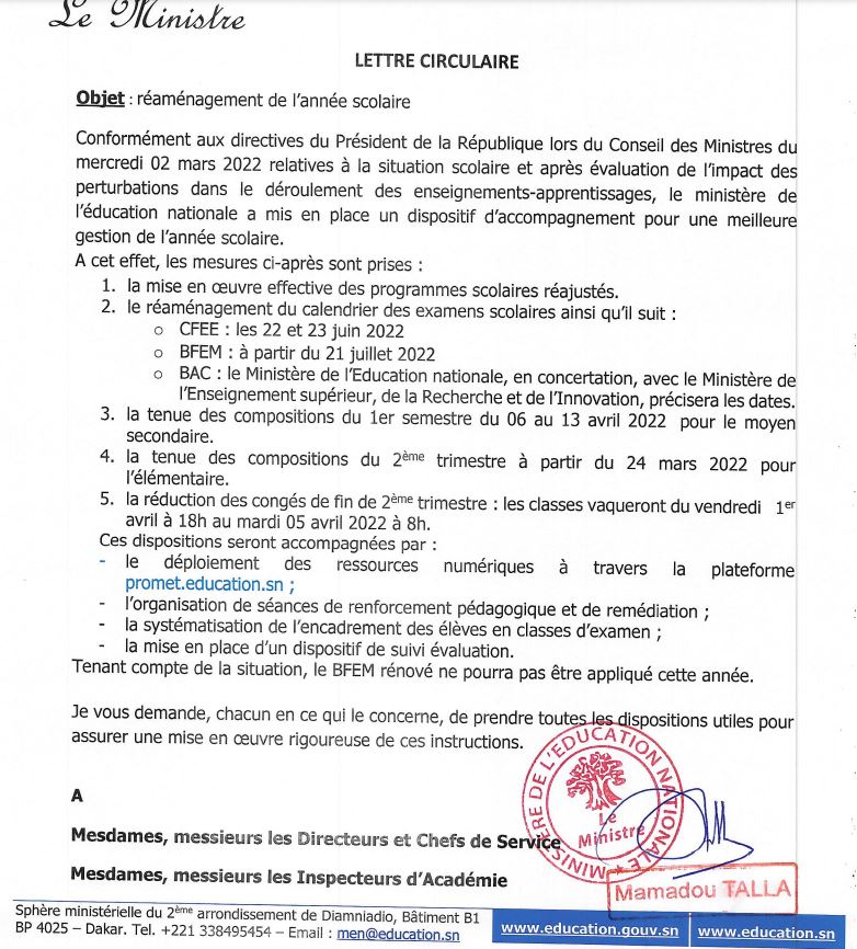Réaménagement du calendrier scolaire : Le ministre de l’éducation