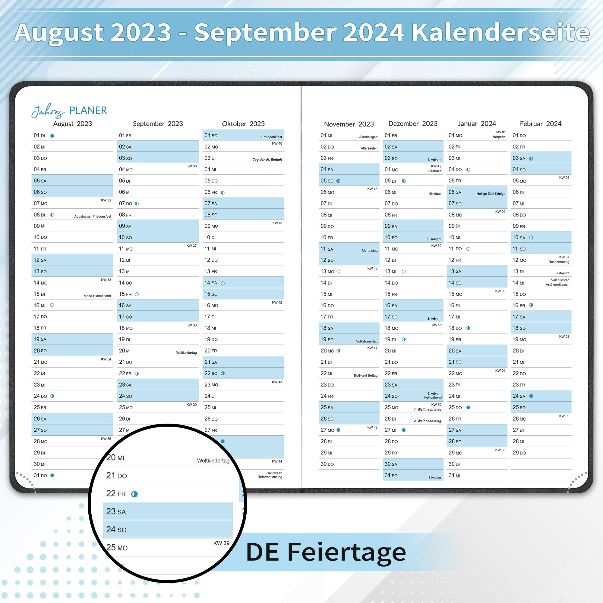 KALENDER 2024 mit Feiertagen Ferien Kalenderwochen